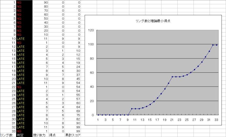 このように取ったときの、総リング数とスコアの関係をグラフにしたのが、